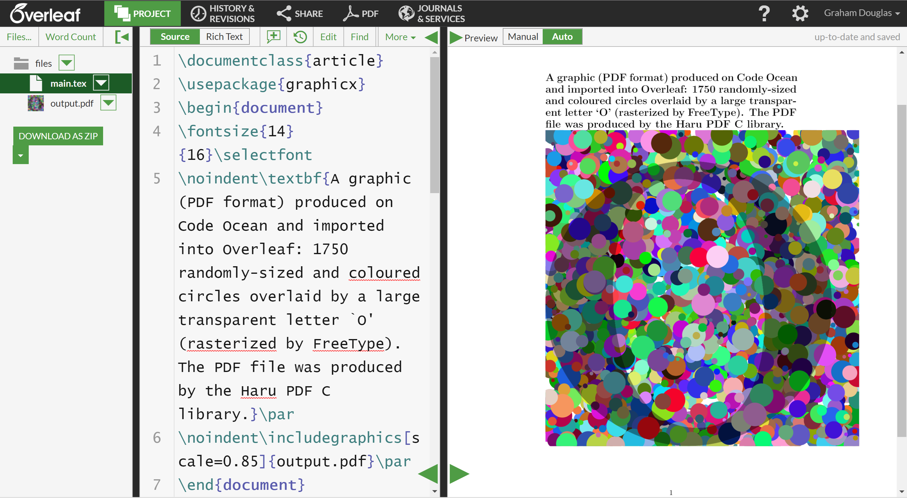 As explained above, uploading unpublished results (files) from a Code Ocean project into Overleaf is extremely easy: download them to your local device and then re-upload them into your Overleaf project. The following screenshot contains a graphic (PDF format) produced on Code Ocean and imported into Overleaf: 1750 randomly-sized and coloured circles overlaid by a large transparent letter ‘O’ (rasterized by FreeType). The PDF file was produced by the Haru PDF C library.